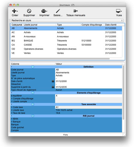 • Journaux (Achats, Ventes,Trésorerie, A-nouveaux, Opérations diverses)